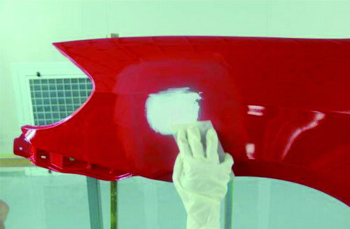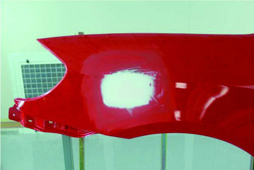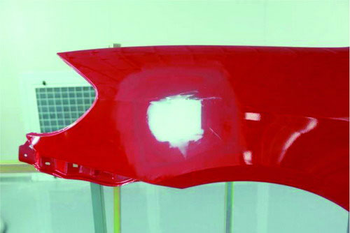 ①砂紙打磨法。在原子灰干燥過程中,可以拿80#的砂紙輕輕地打磨原子灰邊緣薄的部分,檢查原子灰是否已經(jīng)干透。如果沒有干透,則在砂紙上會粘有原子灰;如果已經(jīng)干透,則不會粘上原子灰,并在原子灰上出現(xiàn)堅(jiān)硬的白色痕跡。如圖2-52所示。