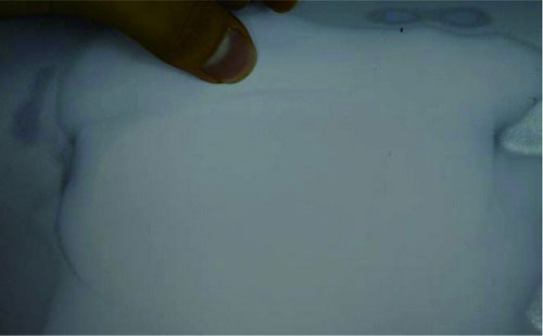 ②指刮法。在原子灰干燥過程中,可以用手指甲輕輕地刮原子灰邊緣薄的部分,檢查原子灰是否已經(jīng)干透。如果沒有干透,則在指甲上會粘有原子灰;如果已經(jīng)干透,則指甲不會粘上原子灰,并在原子灰上出現(xiàn)堅(jiān)硬的白色痕跡。如圖2-53所示。