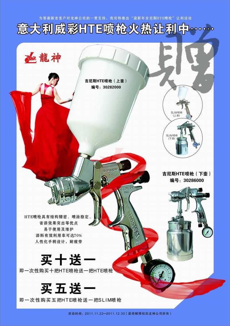 吉尼斯HTE噴槍11月促銷 吉尼斯HTE噴槍2011年11月促銷 (活動已結(jié)束,感謝您的關(guān)注) 一、主題: 吉尼斯HTE噴槍讓利促銷 二、活動目的: 讓利回饋給力促銷 三、活動時間: 1、 時間:2011年11月21日至2011年12月30日 2、 時長:共計40天 四、活動內(nèi)容: 1、 買十送一(即一次購買十把HTE噴槍送一把HTE噴槍) 2、 買五送一(即一次購買五把HTE噴槍送一把SLIM噴槍) 市場部 2011年11月17日 宣傳海報 2011-11-19 12704