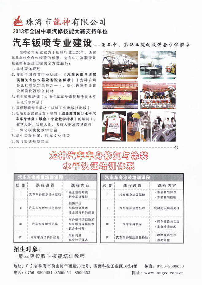 龍神公司專業(yè)致力于鈑噴行業(yè)近20年,通過這幾年校企合作經驗的積累,為各中、高職業(yè)院校鈑噴專業(yè)建設提供全方位服務:
