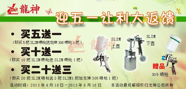 法國佩釜快速接頭促銷方案(產(chǎn)品編號:36102000-36119000)一、主題:“冰夏”促銷行動 二、目的:回饋新老客戶,讓利大反饋 三、時間:1、 啟動時間:2013年5月13日 2、 結(jié)束時間:2013年7月13日3、 時長:2個月 四、活動內(nèi)容:1、 買二十送一(即買二十個快速接頭送一個法國佩釜快速接頭或法法國佩釜吹塵槍(編號:38016)一把) 2、 買五十送三 3、 買八十送防靜電噴漆軟管(編號:36323)五、其它 1、本活動最終解釋權(quán)歸珠海龍神所有。
