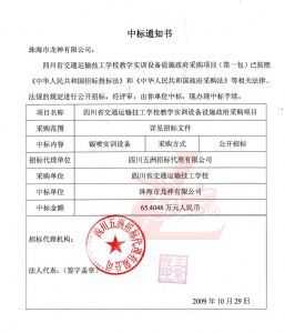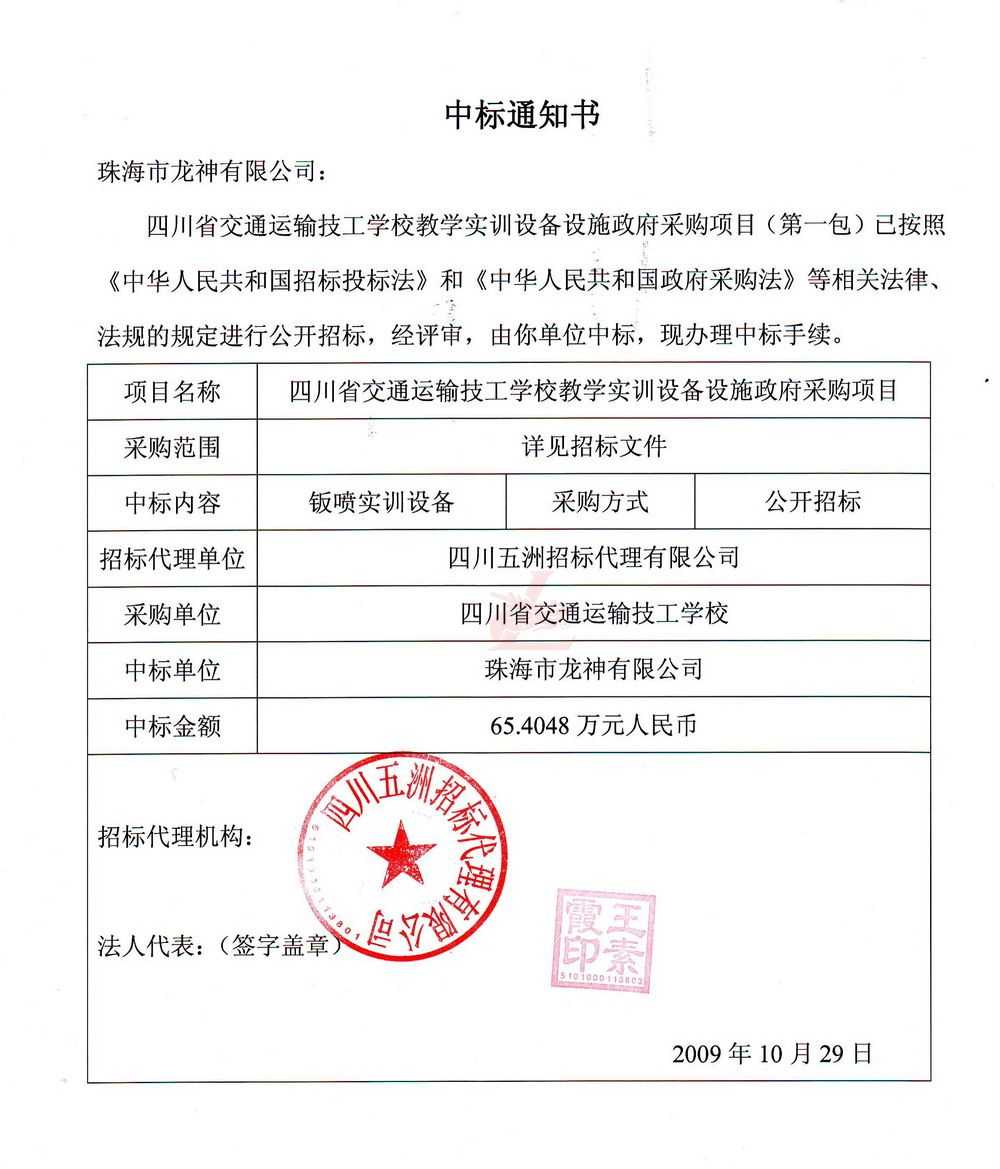 [喜訊]熱烈祝賀龍神成功中標-四川省交通運輸技工學校 [喜訊]熱烈祝賀龍神成功中得四川省交通運輸技工學校標 [新聞中心]珠海市龍神有限公司經(jīng)過長時間的籌備已成功中得四川省交通運輸技工學校教學實訓設(shè)備設(shè)施政府采購項目標,這是珠海市龍神有限公司一種實力的表現(xiàn)。說明了珠海龍神的品牌在不斷的加強、深化。 珠海龍神公司一直專業(yè)、效率、服務(wù)、環(huán)保。同時“龍神”在創(chuàng)新中求發(fā)展,在發(fā)展中求創(chuàng)新的原則。 (中標通知書,點擊放大圖) 2009-11-06 9022